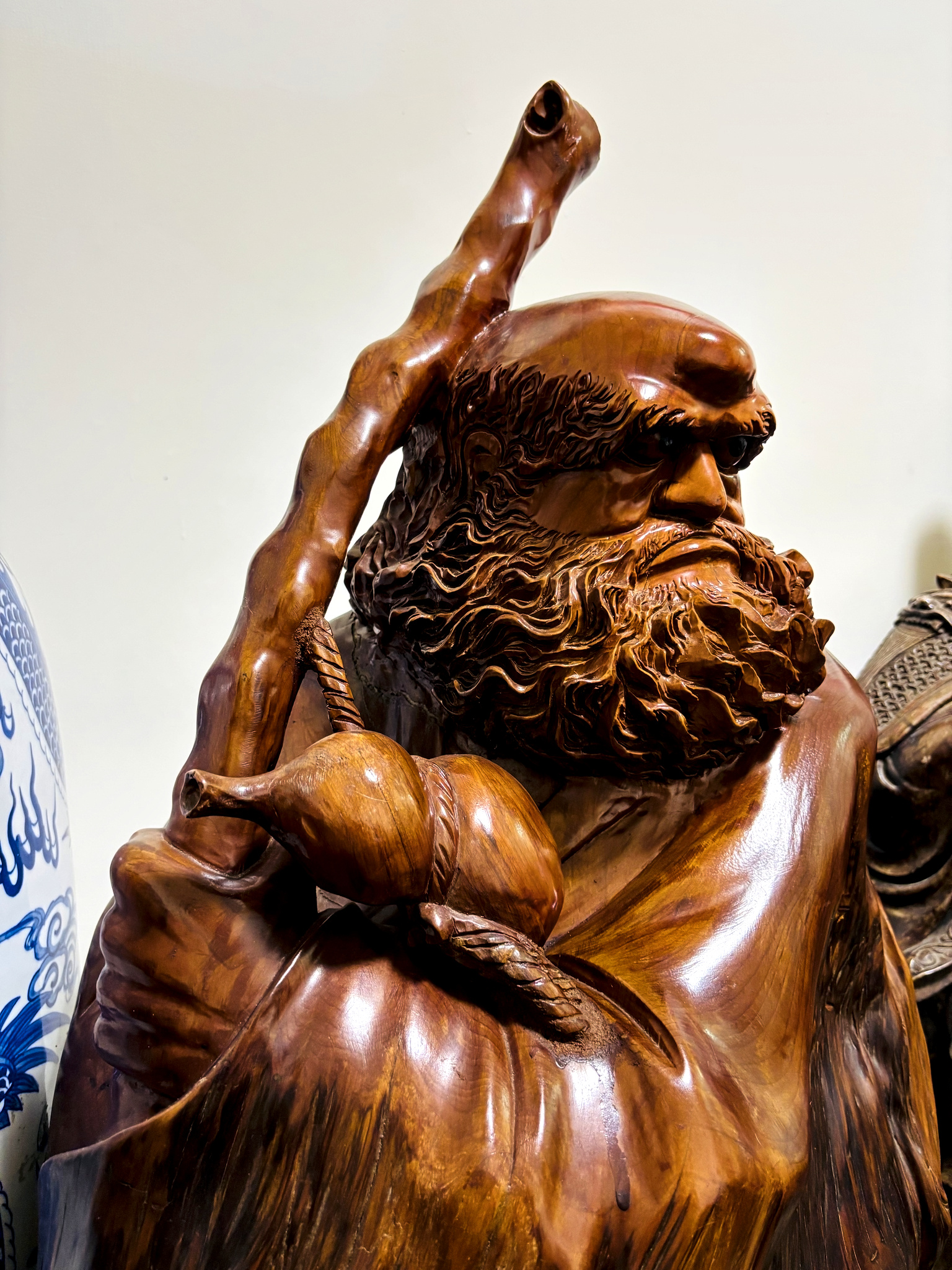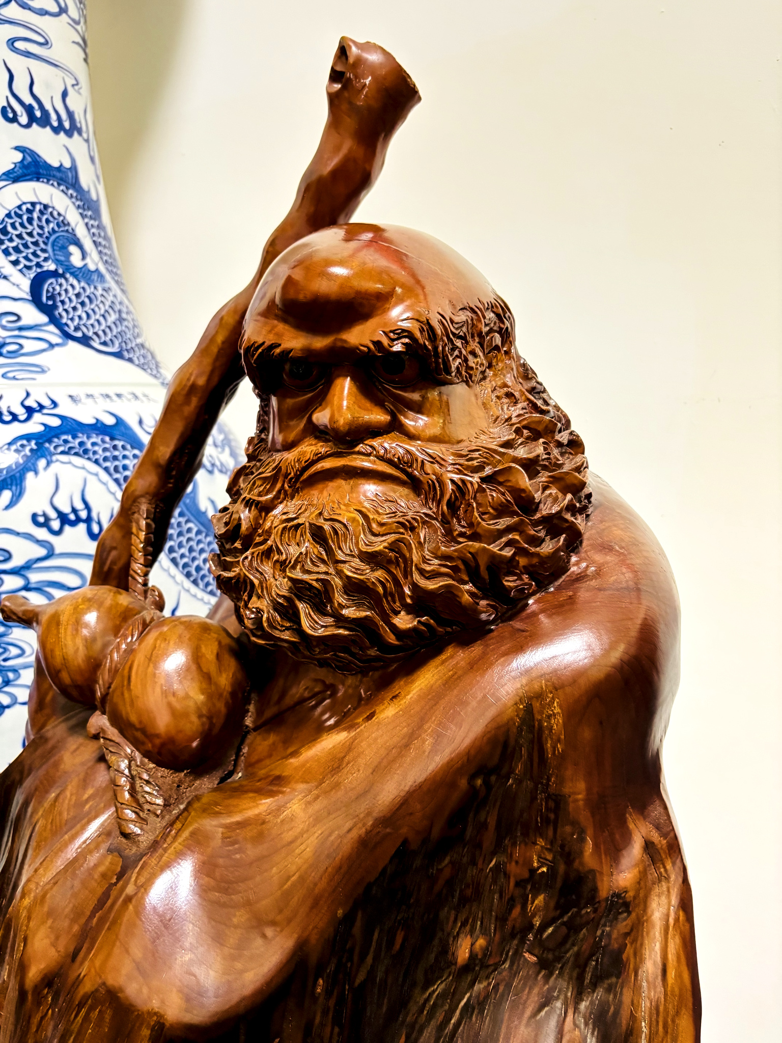 This Bodhidharma wooden sculpture, from the Qing Dynasty, is made of solid hardwood. The delicate carving makes the beard appear as if flowing. His deep gaze seems to span centuries, still watching over the world’s turmoil and tranquility.
