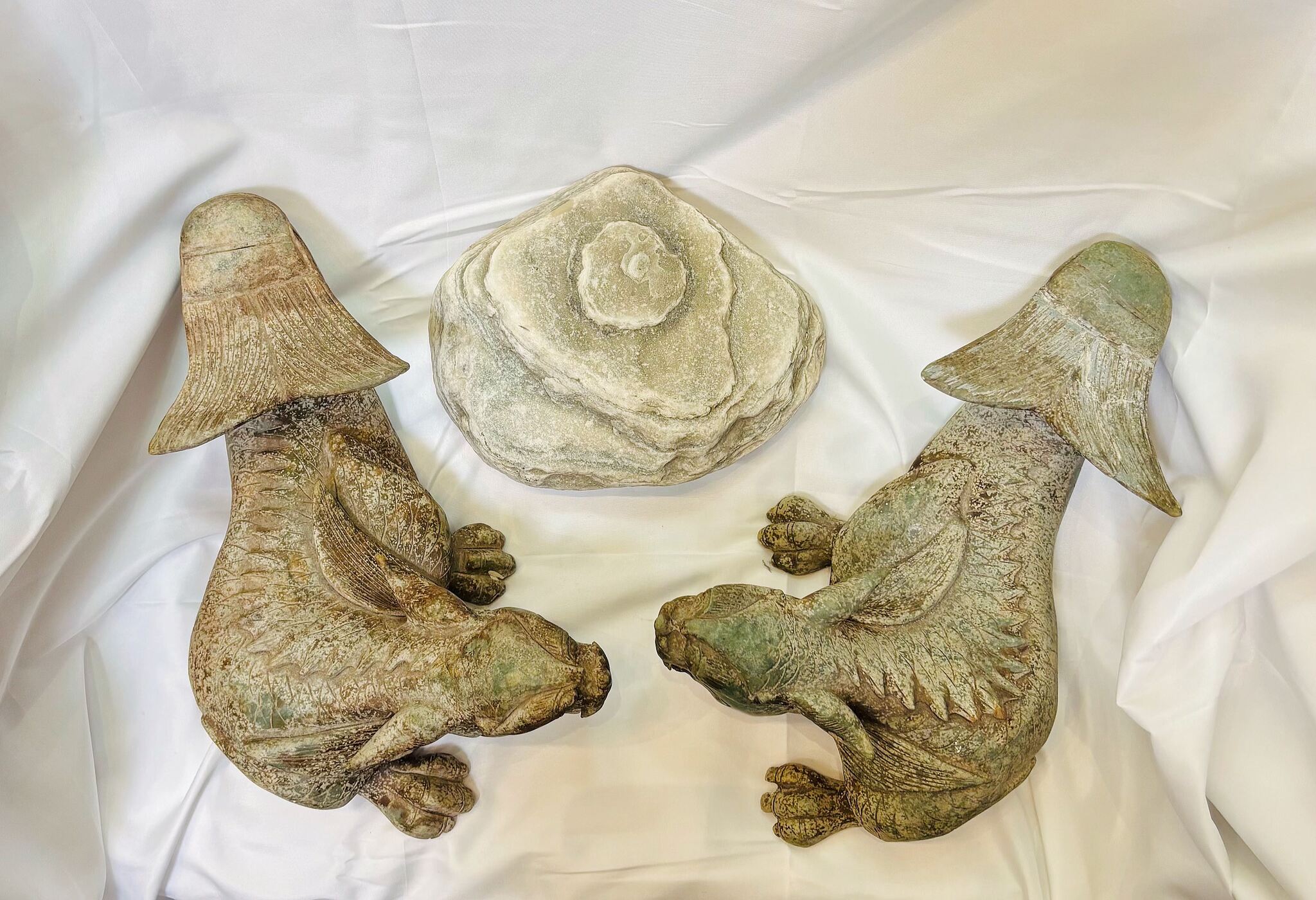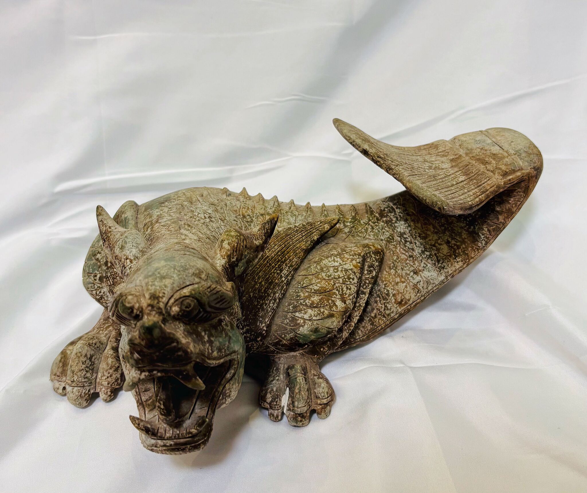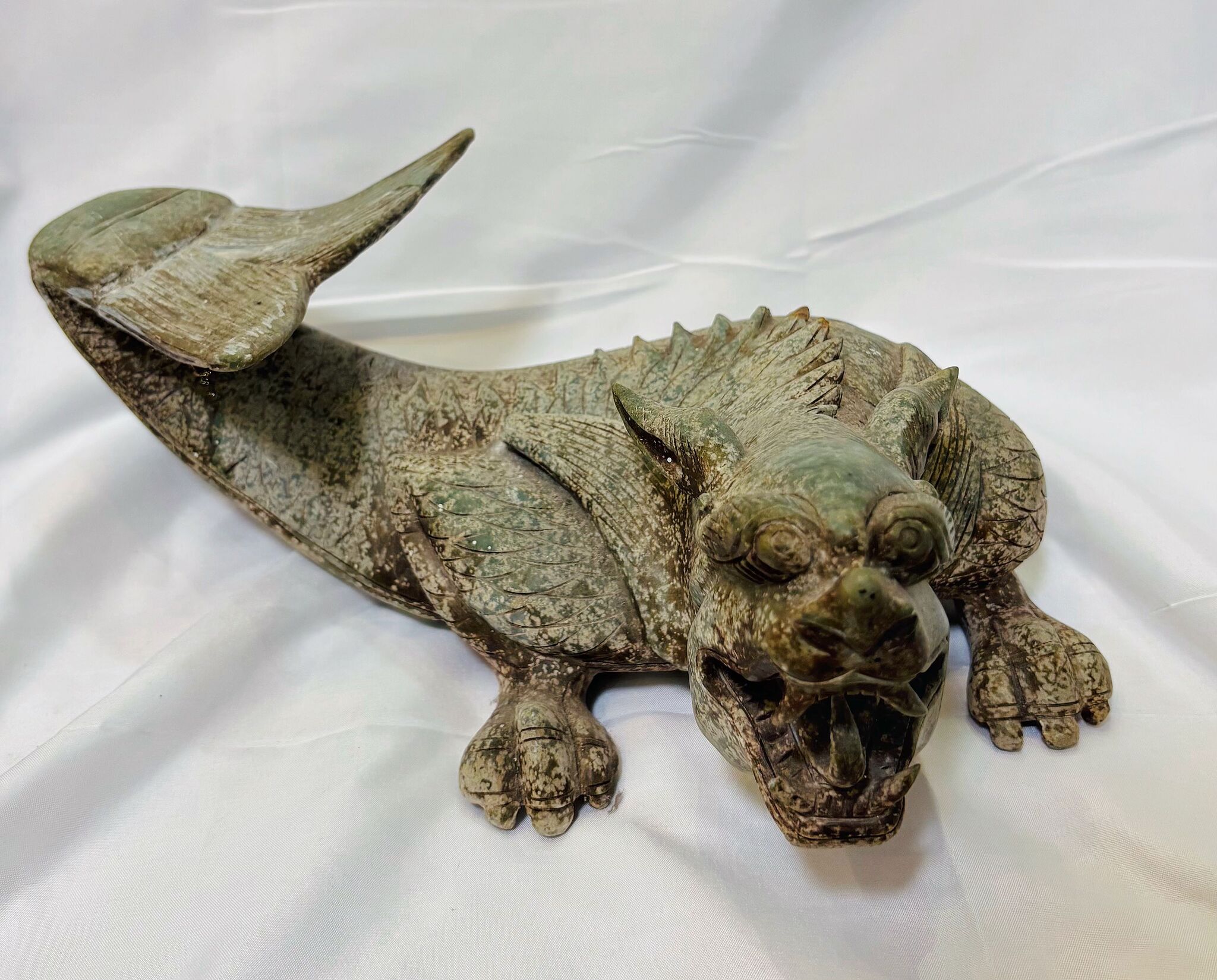 This pair of stone mythical beasts is depicted crouching with raised heads, their forms powerful and imposing. Their wide eyes and gaping mouths reveal sharp teeth, exuding majesty and strength. Finely carved scales and wing-like motifs cover their backs, while uplifted tails suggest riding the wind and offering protection for peace and safety.