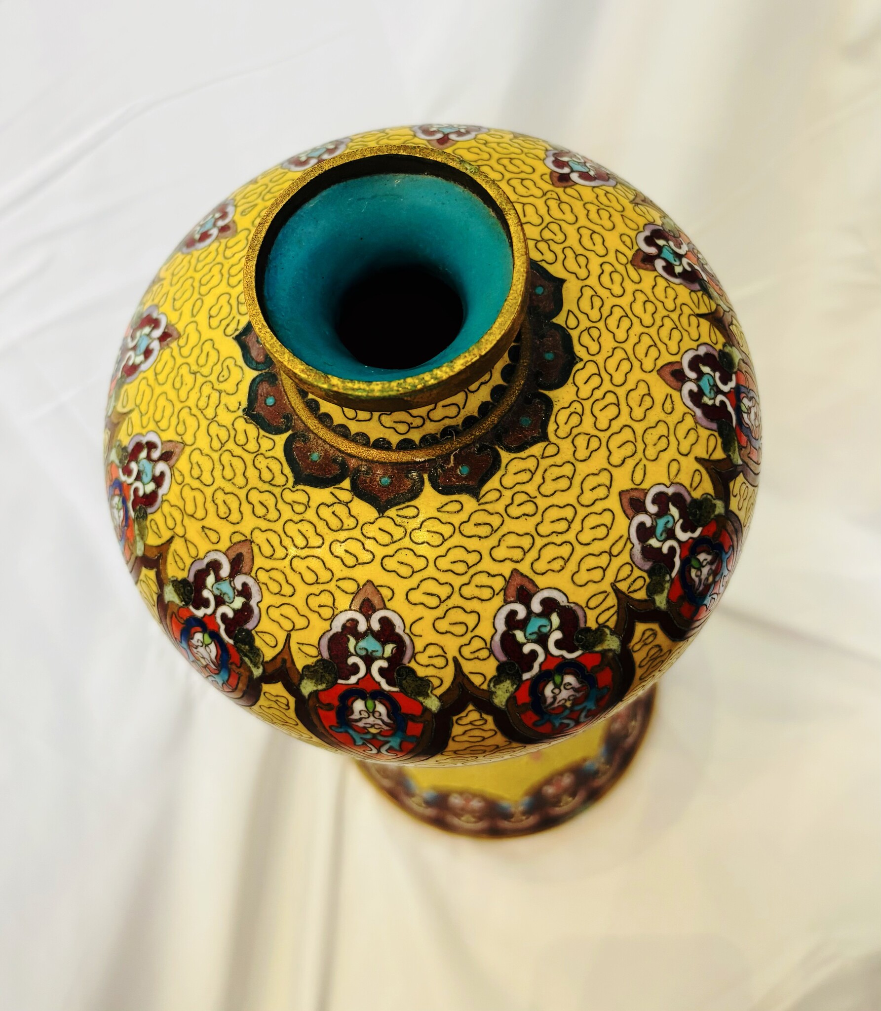 This large cloisonné enamel vase features a yellow ground, symbolizing nobility and auspiciousness. The entire surface is decorated with entwined floral scrolls and cloud motifs, outlined in fine copper wires and filled with bright red, blue, and green enamels. The vivid yet dignified colors are complemented by a band of elaborate lotus patterns around the shoulder, symbolizing beauty and prosperity. The smooth transition from the body to the base conveys a sense of grandeur and elegance.